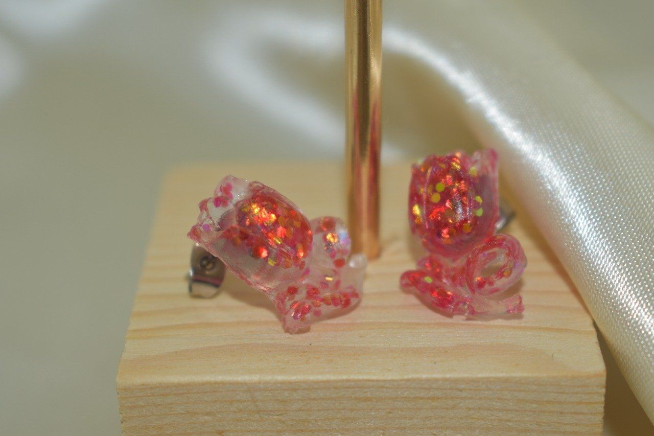 ➔ La troisième paire de boucles d'oreilles est représenté par une tulipe représenté avec des paillettes. Il s'agit d'une paire de boucles d'oreilles courtes, parfaite pour mettre ou débuter votre collection de bijoux artisanal. Les boucles d'oreilles sont faites en matière de résine et elles sont ornées avec des paillettes argentées, qui leurs donnent un aspect scintillant. Ces boucles d'oreilles sont accompagnées d'un fermoir sur chaque boucle d'oreille sur chacune des puces. Les puces qui ont été mis sur chaque boucles d'oreilles sont en acier inoxydable dont inaltérable, hypoallergique.
