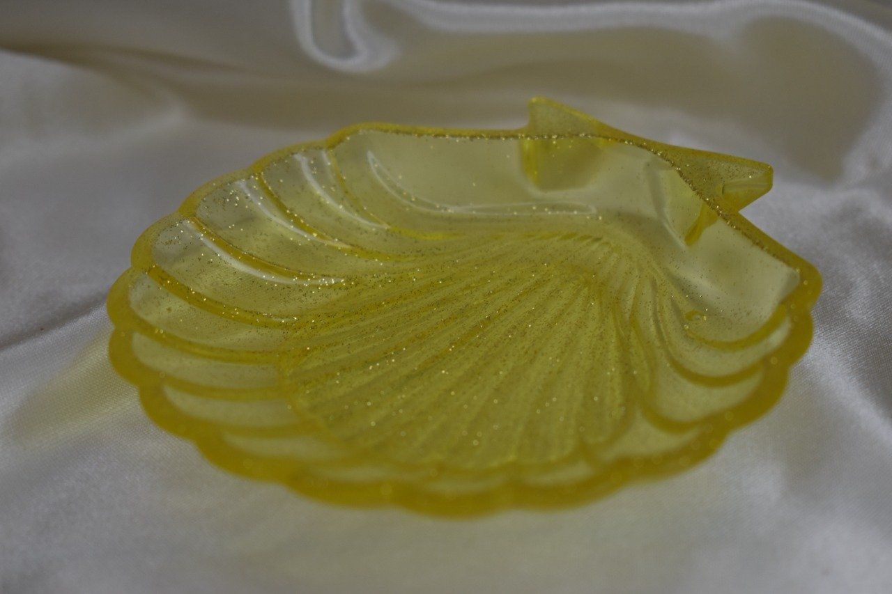 ➔ Le premier vide-poches en forme de coquillage est représenté de couleur jaune avec des paillettes. Il s'agit d'un vide-poches qui peut être utilisé comme pour des petits objets tels que les clés, les bijoux ou les pièces de monnaie... parfait pour vous l'offrir ou offrir autour de vous. Le vide-poches en forme de coquillage est fait en matière de résine et il est orné de couleur jaune avec des paillettes jaunes, qui lui donnent un aspect scintillant.