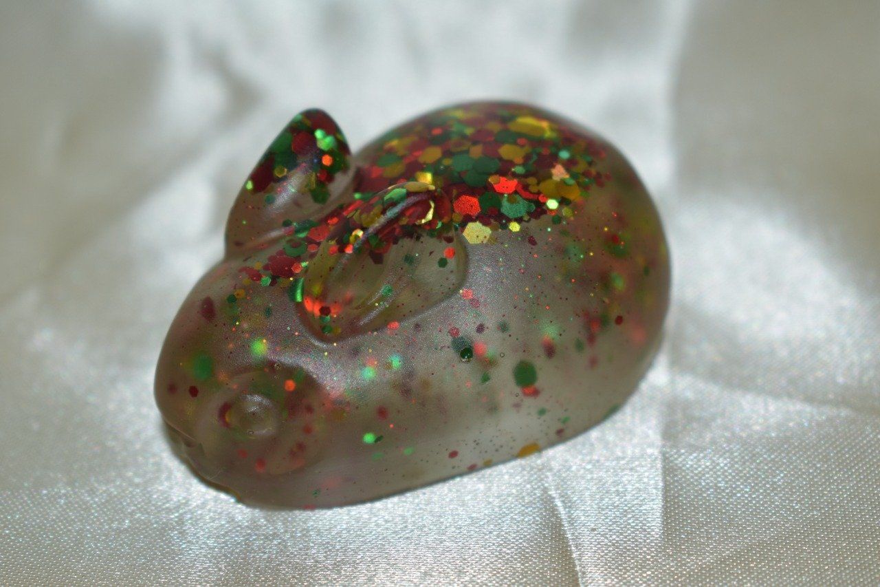➔ La deuxième figurine en forme de lapin est représenté avec des paillettes. Il s'agit d'une figurine qui peut être utilisé pour votre décoration, parfait pour vous l'offrir ou offrir autour de vous. Le lapin est fait en matière de résine et il est orné de paillettes rouges, vertes et dorées, qui lui donnent un aspect scintillant.