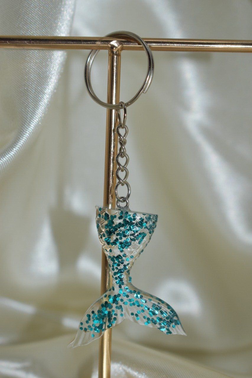 ➔ Le septième porte-clé est représenté par une petite queue de sirène avec des paillettes. Il s'agit d'un porte-clé, parfait pour accrocher à vos clés ou à votre sac. La queue de sirène est faite en matière de résine et elle est ornée avec des paillettes bleues claires, qui lui donnent un aspect brillant.