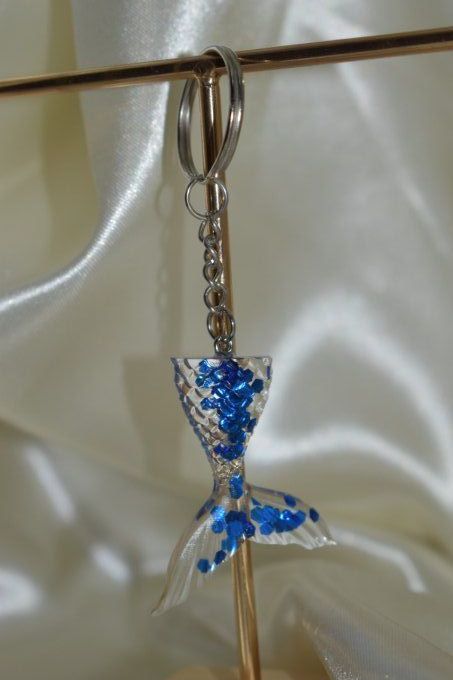 ➔ Le quatrième porte-clé est représenté par une petite queue de sirène avec des paillettes. Il s'agit d'un porte-clé, parfait pour accrocher à vos clés ou à votre sac. La queue de sirène est faite en matière de résine et elle est ornée avec des paillettes bleues foncé, qui lui donnent un aspect scintillant.