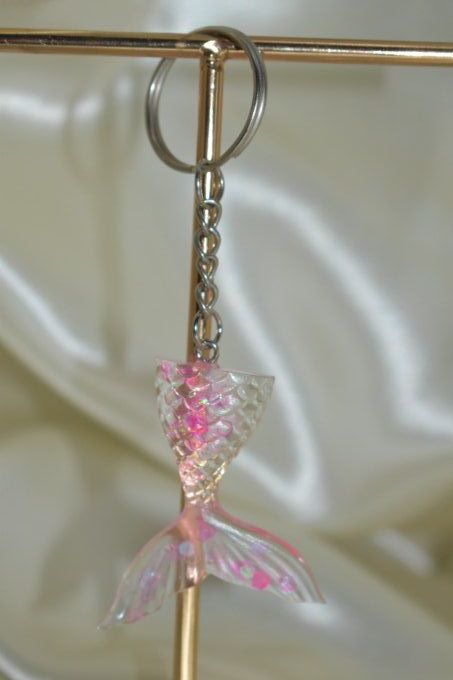 ➔ Le premier porte-clé est représenté par une petite queue de sirène avec des paillettes. Il s'agit d'un porte-clé, parfait pour accrocher à vos clés ou à votre sac. La queue de sirène est faite en matière de résine et elle est ornée avec des paillettes roses, qui lui donnent un aspect brillant.