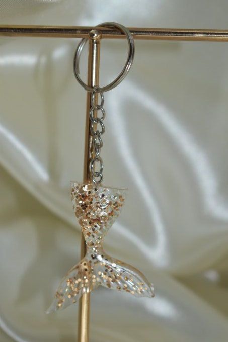➔ Le troisième porte-clé est représenté par une petite queue de sirène avec des paillettes. Il s'agit d'un porte-clé, parfait pour accrocher à vos clés ou à votre sac. La queue de sirène est faite en matière de résine et elle est ornée avec des paillettes argentées, qui lui donnent un aspect brillant.