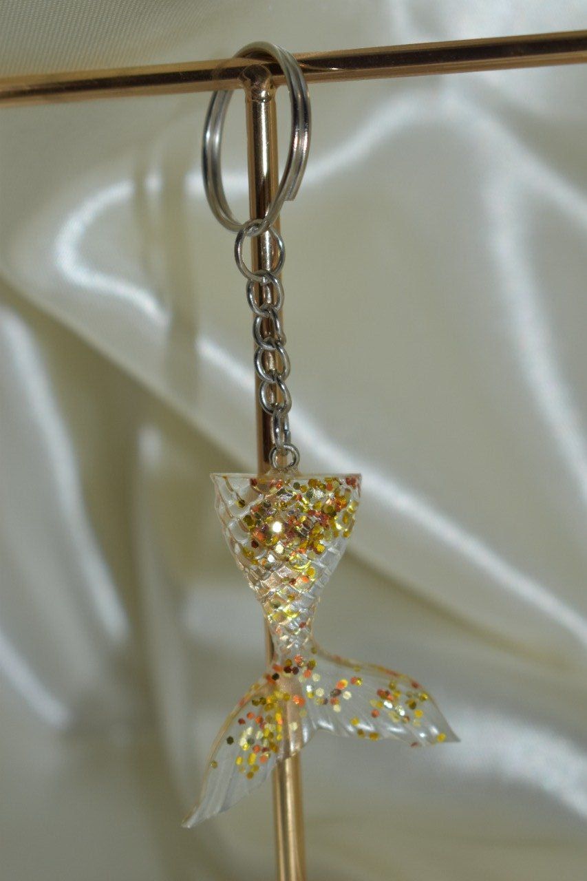 ➔ Le deuxième porte-clé est représenté par une petite queue de sirène avec des paillettes. Il s'agit d'un porte-clé, parfait pour accrocher à vos clés ou à votre sac. La queue de sirène est faite en matière de résine et elle est ornée avec des paillettes roses vieux, qui lui donnent un aspect scintillant.