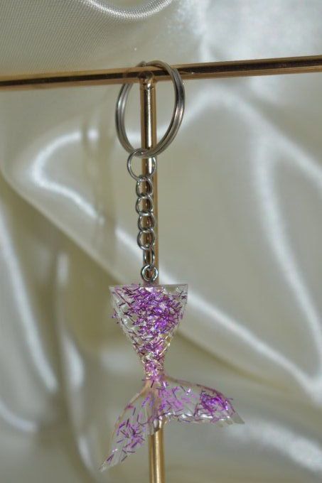 ➔ Le quatrième porte-clé est représenté par une petite queue de sirène avec des paillettes. Il s'agit d'un porte-clé, parfait pour accrocher à vos clés ou à votre sac. La queue de sirène est faite en matière de résine et elle est ornée avec des paillettes violettes, qui lui donnent un aspect scintillant.